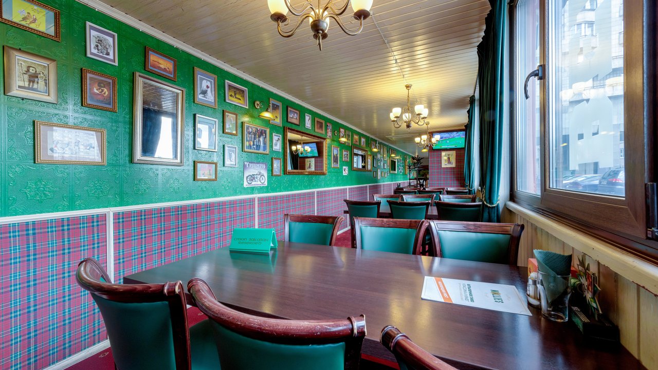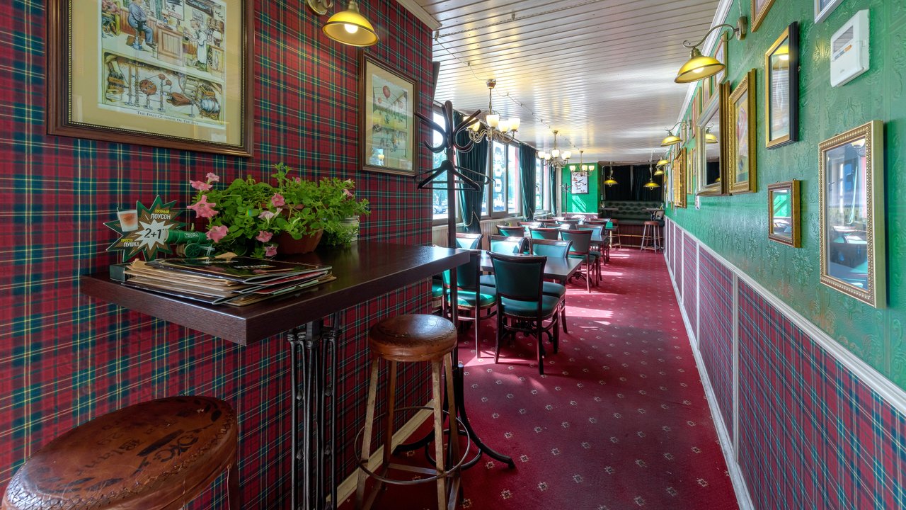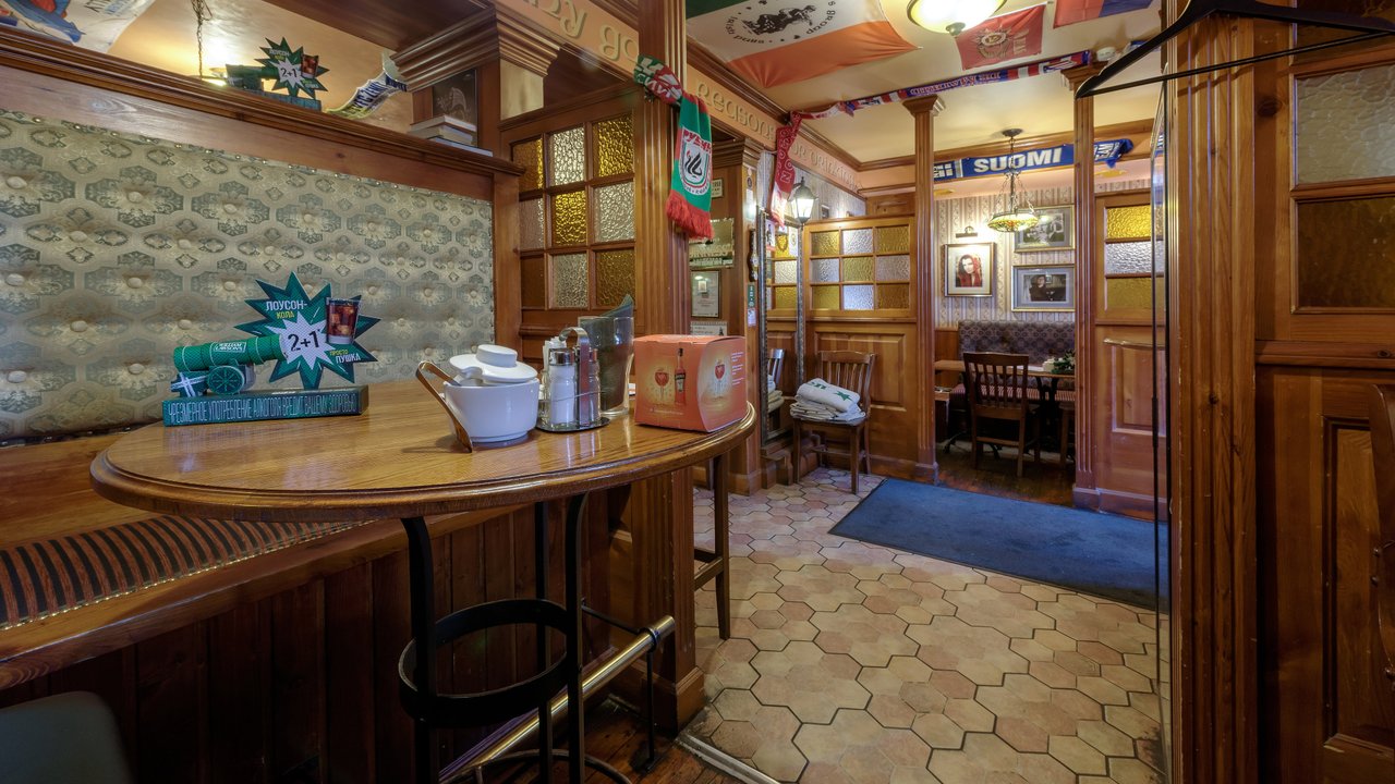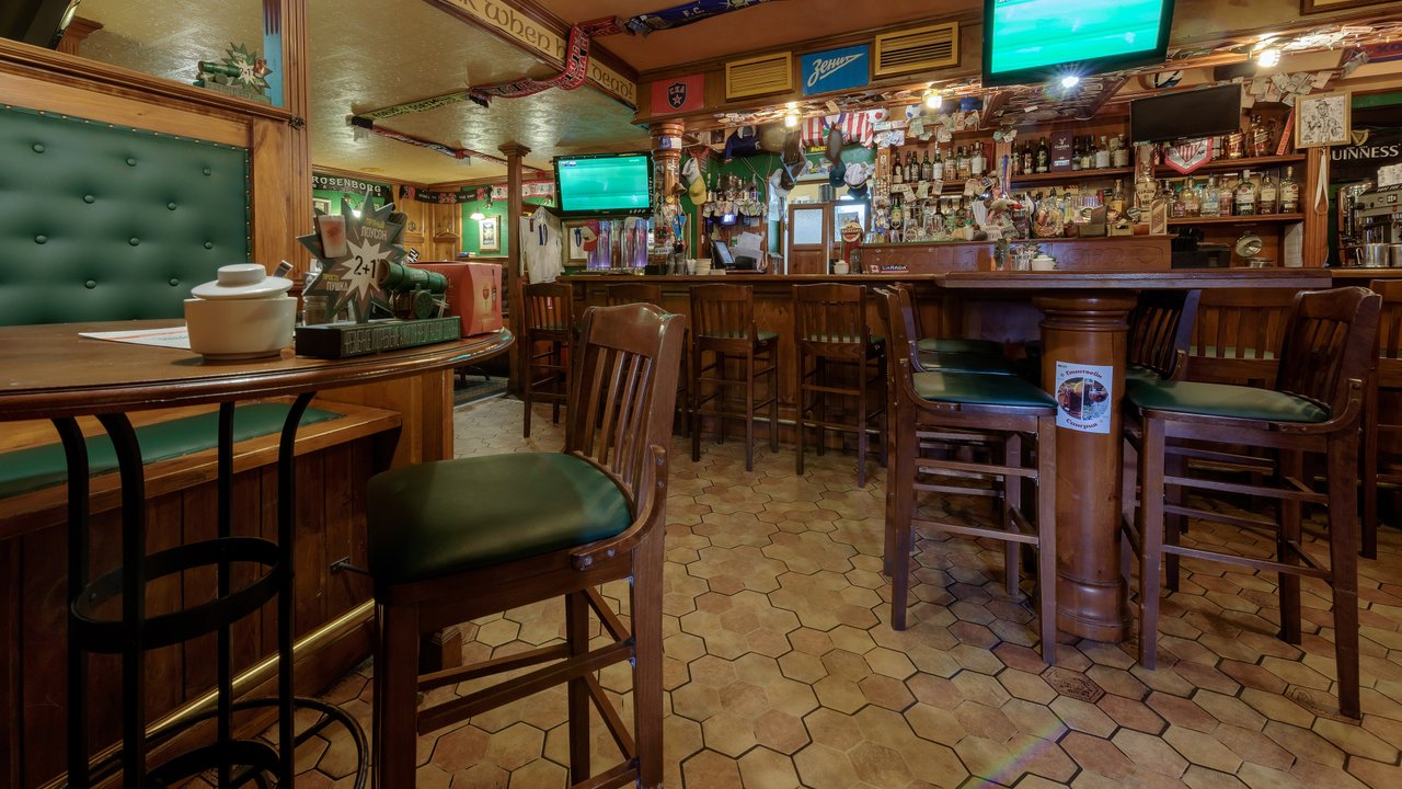 Бар отличный, я хожу в него давно. Персонал здесь отличный. Ребята молодцы, общительные, отзывчивые. В основном мне нравится обслуживание и еда. Еда вкусная, напитки прекрасные. Из напитков мне нравится виски, пиво, всевозможные коктейли и шотики. Я любитель таких вещей, бармен замечательно смешивает, знает массу всевозможных коктейлей. Из еды мне нравится стейк, в основном я кушаю здесь мясо. Мясо приготовлено замечательно. Пиццу брал пару раз, мне тоже понравилось. В заведении классический интерьер ирландского бара, атмосфера домашняя, можно посидеть и за барной стойкой, и за столиком. Куда не сядешь, везде замечательно.