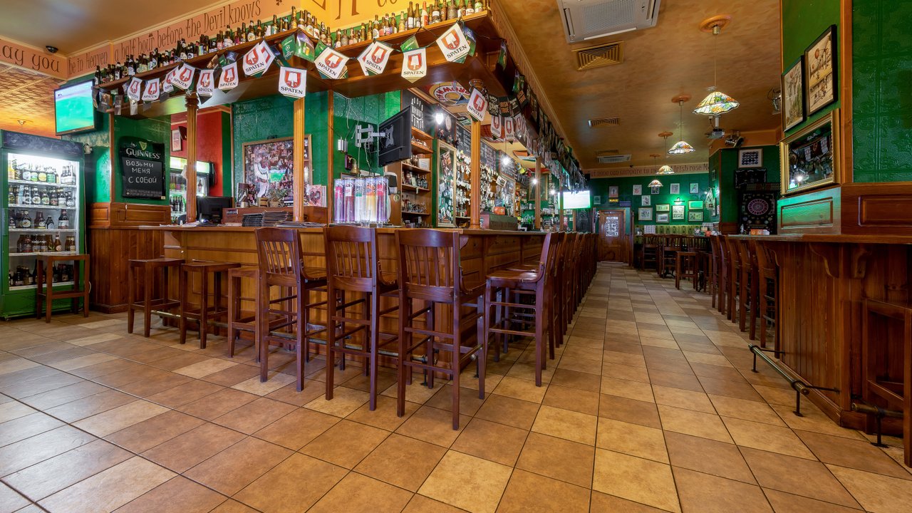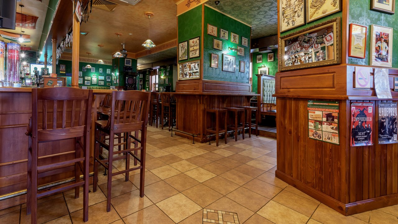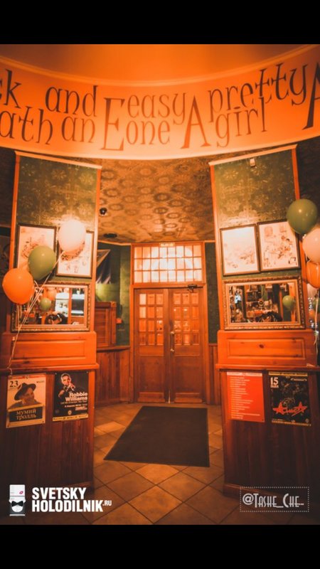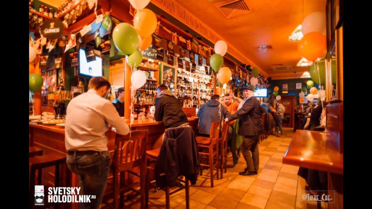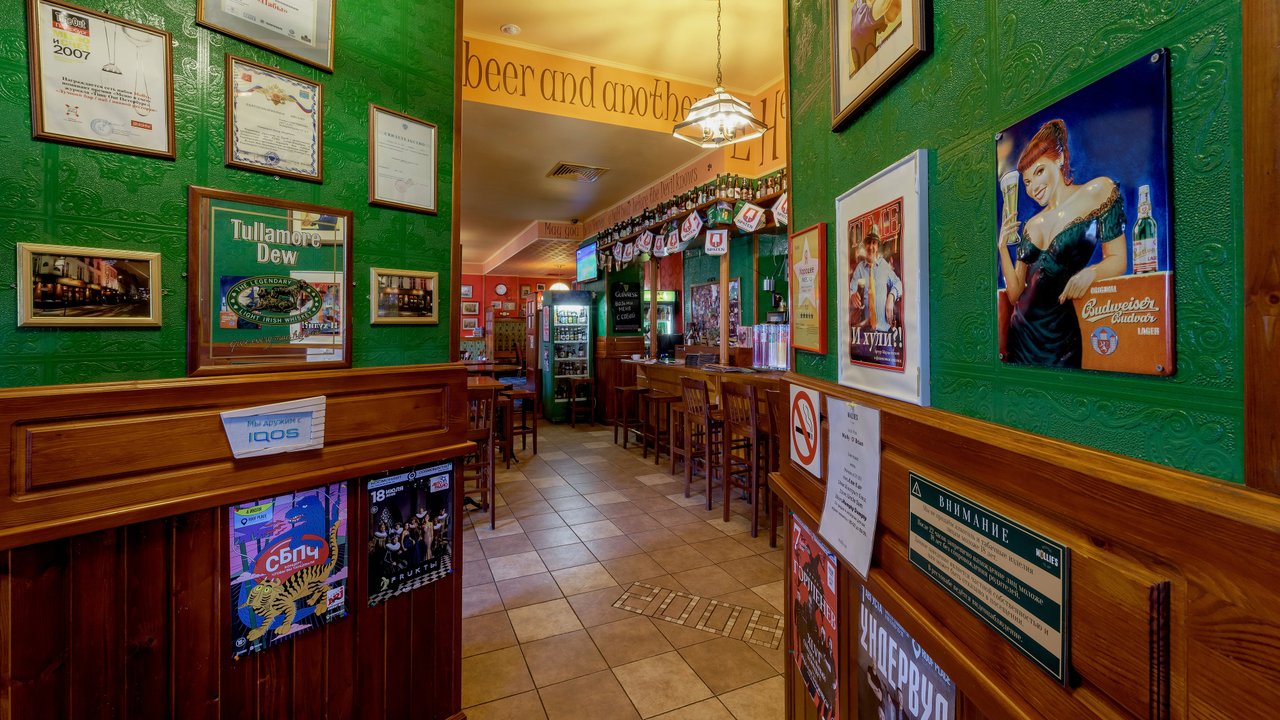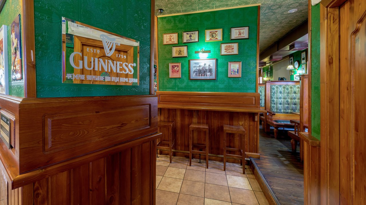 Живем в этом доме и, если хочется нам посидеть, мы с мужем ходим сюда. Я всегда пью только вишневое пиво, муж пьет разное. Закуски разные, и горячие, и стейки - муж заказывает, в зависимости от настроения, от чувства голода. Девушки-официанты, давно работают и знают нас в лицо, хочется надеяться на это. По именам не скажу, работаю в школе с именами проблема у меня. Паб открыт с самого начала постройки дома, это порядком 10 лет, все в приличном состоянии. Что-то дополняют, что-то убирают, корректируют. На столах стоят салфетки красивого зеленого ирландского цвета, соль, перец, зубочистки. Всегда присутствует комплимент от шеф-повара: оливки зеленые с косточкой в маленьких пиалках, сыр. В пятницу и субботу, живая музыка: рок-н-рол и джаз, достаточно сложно забронировать столик. Играет трио или квартет. Бармен потрясающий, бесподобный, колоритный, огромный, с бородой - настоящий пивной бармен! Некоторые завсегдатели приходят с ним пообщаться, особенно, когда футбол идет. Висят огромные экраны, бронируют за несколько суток, чтобы попасть сюда.