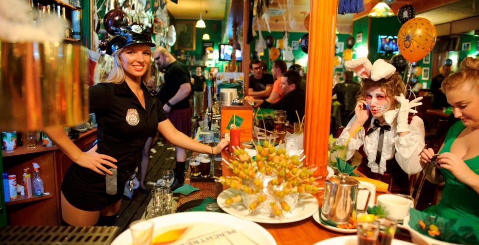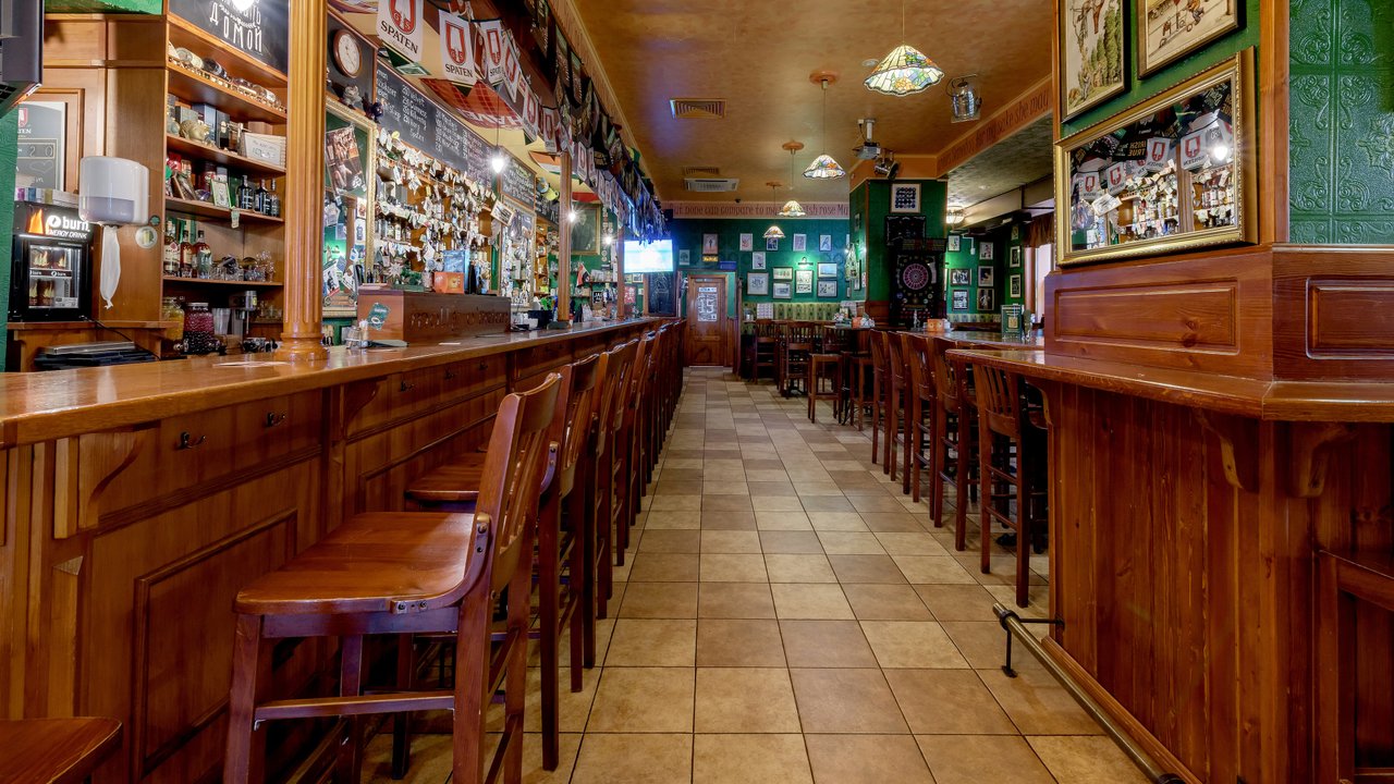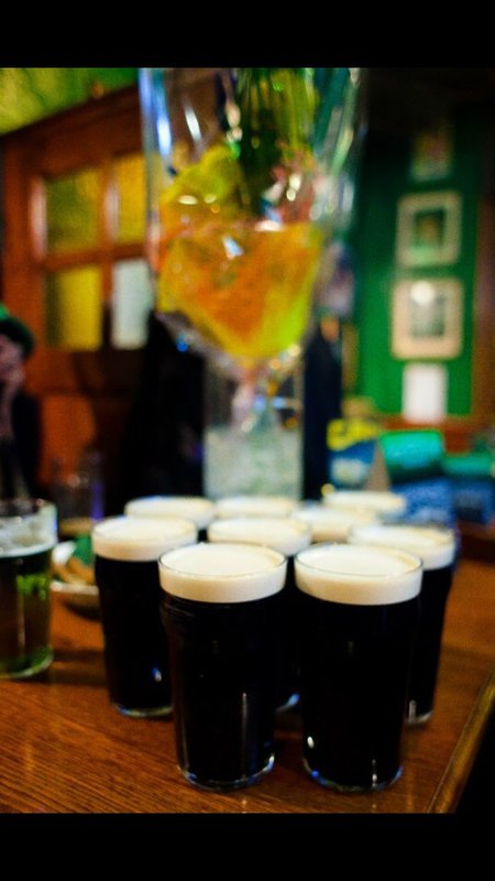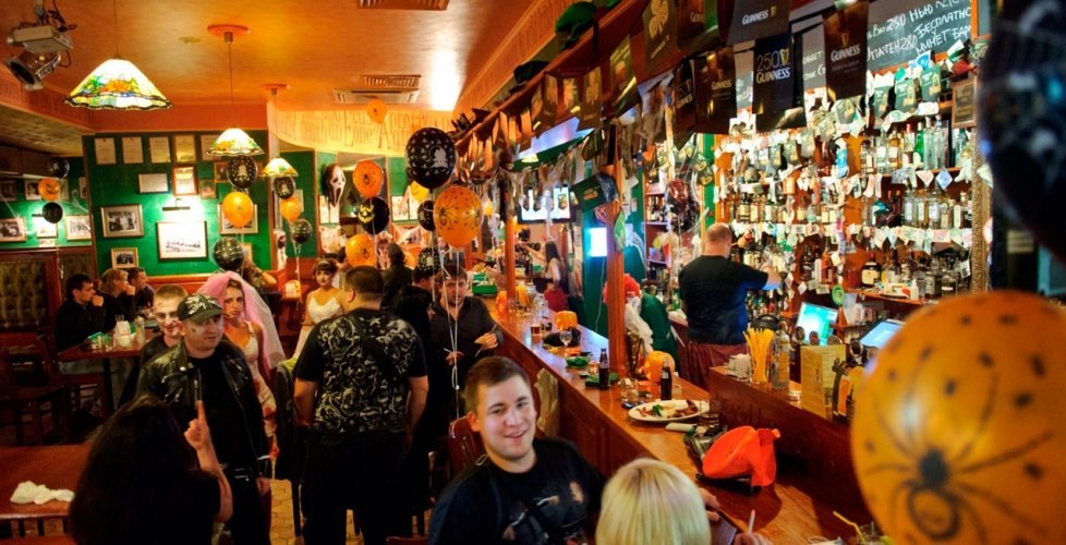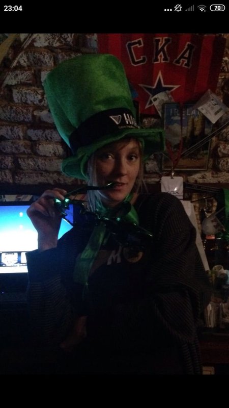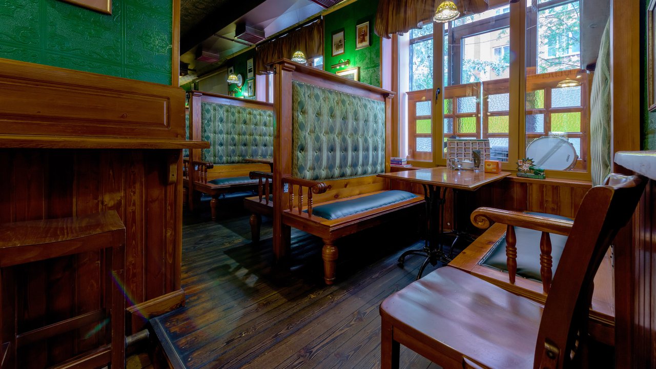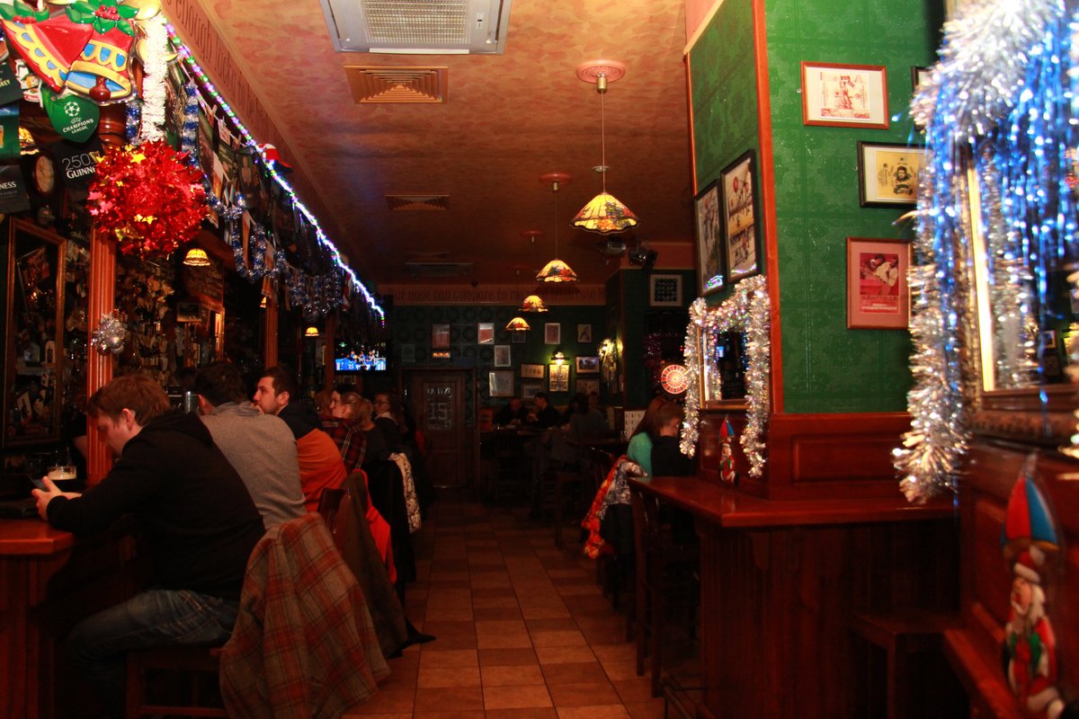 Живем в этом доме и, если хочется нам посидеть, мы с мужем ходим сюда. Я всегда пью только вишневое пиво, муж пьет разное. Закуски разные, и горячие, и стейки - муж заказывает, в зависимости от настроения, от чувства голода. Девушки-официанты, давно работают и знают нас в лицо, хочется надеяться на это. По именам не скажу, работаю в школе с именами проблема у меня. Паб открыт с самого начала постройки дома, это порядком 10 лет, все в приличном состоянии. Что-то дополняют, что-то убирают, корректируют. На столах стоят салфетки красивого зеленого ирландского цвета, соль, перец, зубочистки. Всегда присутствует комплимент от шеф-повара: оливки зеленые с косточкой в маленьких пиалках, сыр. В пятницу и субботу, живая музыка: рок-н-рол и джаз, достаточно сложно забронировать столик. Играет трио или квартет. Бармен потрясающий, бесподобный, колоритный, огромный, с бородой - настоящий пивной бармен! Некоторые завсегдатели приходят с ним пообщаться, особенно, когда футбол идет. Висят огромные экраны, бронируют за несколько суток, чтобы попасть сюда.